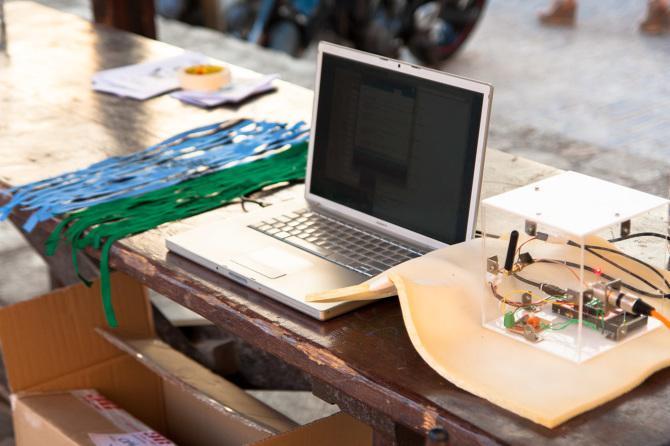 Χρησιμοποιήθηκε arduino με GSM shield για την λήψη και την επεξεργασία των sms καθώς και custom-made dmx shield για την επικοινωνία με τους DMX προβολείς.