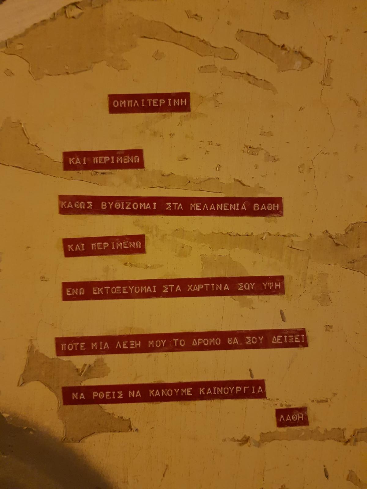 Άλλοτε ποιήματα κι άλλοτε σκόρπιες λέξεις, γραμμένες με ετικετογράφο mini-print και κολλημένες σε σημεία της πόλης.